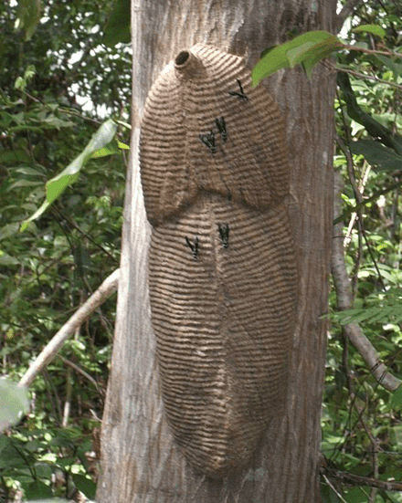 The nest is usually found in rock surfaces and trees, has various cells and is covered by a ribbed envelope. It also has one or more rounded holes that work as entrances and exits to the nest.